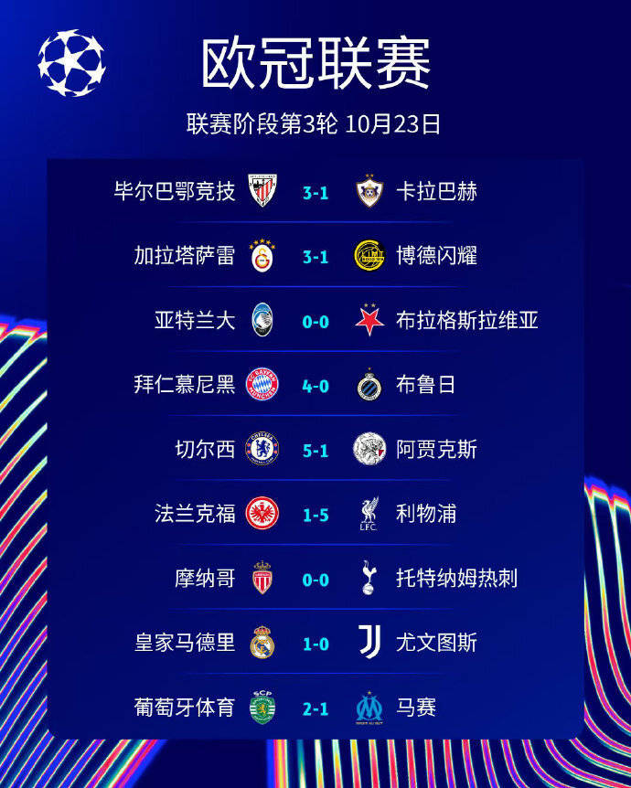 此外,毕尔巴鄂竞技3-1力克卡拉巴赫,加拉塔萨雷同样以3-1的比分战胜博德闪耀,切尔西则在主场以5-1的悬殊比分大胜阿贾克斯。而亚特兰大与布拉格斯拉维亚互交白卷,摩纳哥与热刺则握手言和,互交白卷。葡萄牙体育在主场以2-1的比分小胜马赛。